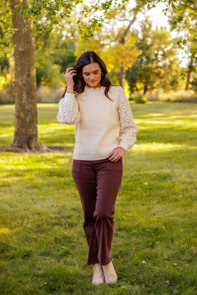 - MIX MEDIA - RIB SWEATER BODICE - MOCK NECK WITH RUFFLED LACE - WOVEN LACE PUFF SLEEVE - BACK KEYHOLE - SIDE SMALL SLIT - RELAXED FIT